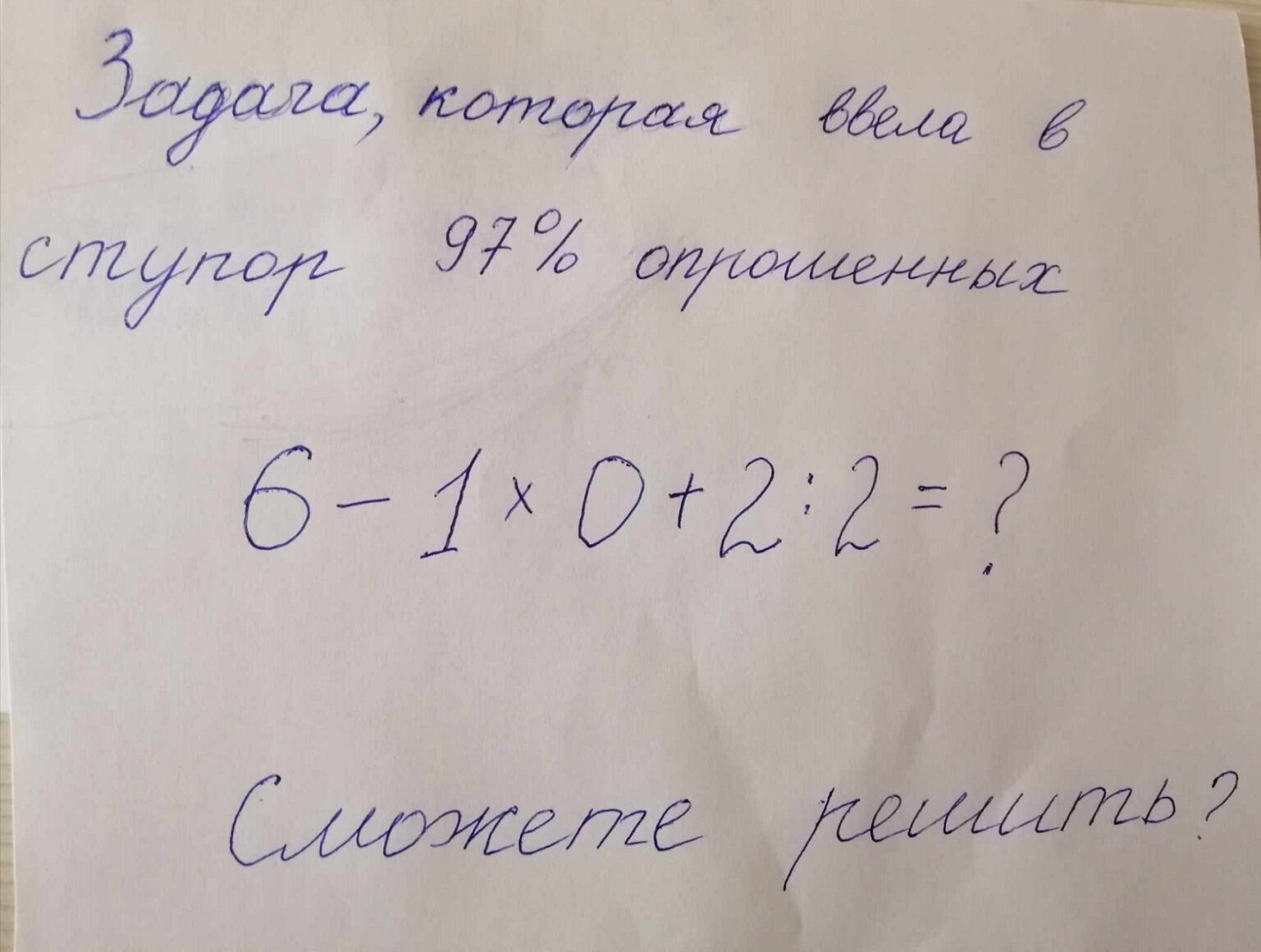 Пример выглядел так: шесть минус один умножить на ноль плюс два разделить на два равно чему.