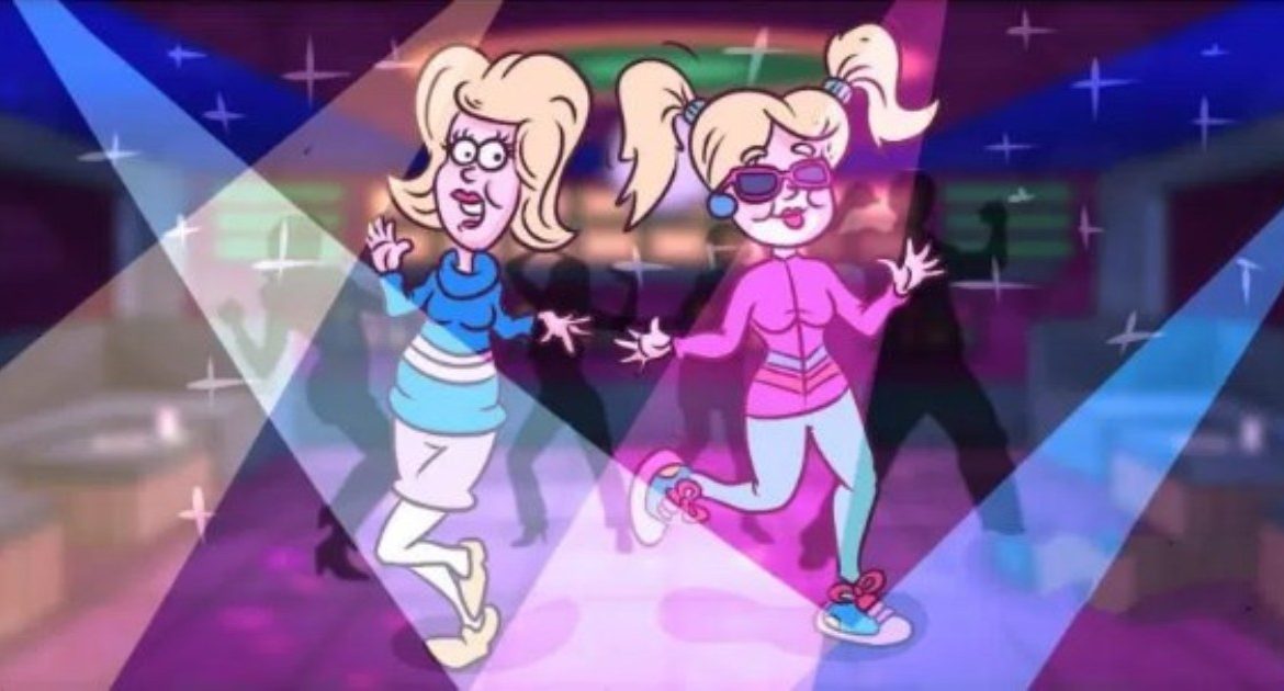 Народ в экстазе мордуется под зеркальным шаром, лосины трещат, люрекс парусами , всем хорошо и даже больше. (В сумочках у взрослых дядь и теть, в угоду реконструкции эпохи бутылочки с крепкими спиртными напитками. Туалет-бар , все как на школьной дискотеке).