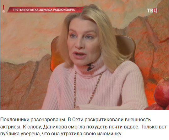 Данилову все хорошо знают благодаря комедийному проекту “6 кадров”. Поклонники любили ее харизму, обаяние, уникальность. Сейчас же ее совсем не узнать. Чересчур много пластики и инъекций было сделано.